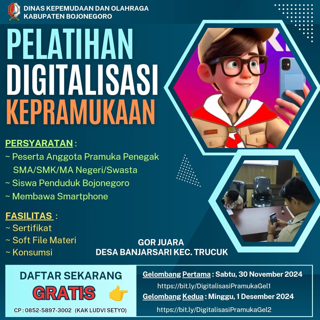 Ayo Daftarkan Dirimu segera di Pelatihan Digitalisasi Kepramukaan🔥 Pendaftaran GRATIS untuk semua anggota Pramuka Penegak SMA/SMK/MA Negeri/Swasta se-Bojonegoro dan dapatkan Fasilitas berupa Sertifikat,...